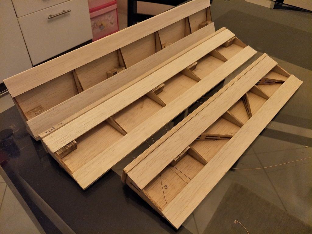 ailerons and flaps withe sheetng, gotta glue some cap strips. I should have installed the 45 degree additional ribs of the flaps (wider ones).