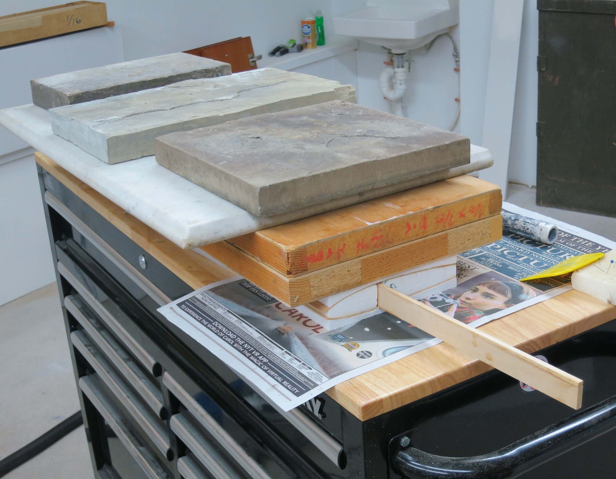 Hollow core doors cover cores and give even pressure from weights.